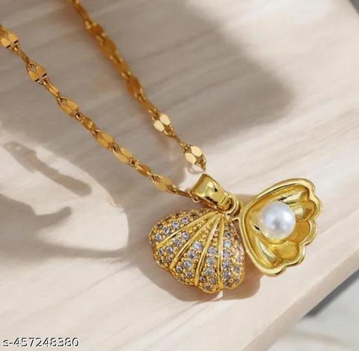 This elegant necklace features a unique shell-shaped pendant that opens to reveal a lustrous faux pearl inside. The exterior of the shell is adorned with sparkling cubic zirconia stones, adding brilliance and luxury to the design. The pendant hangs gracefully from a twisted 18k gold-plated chain, making it a timeless and versatile piece.